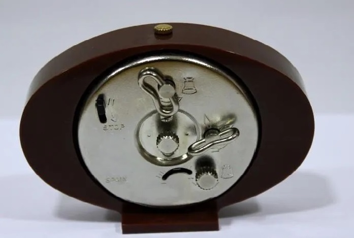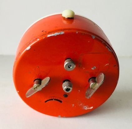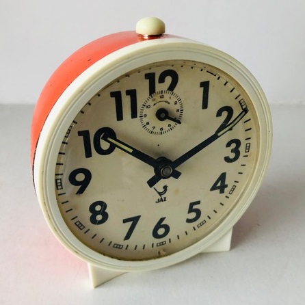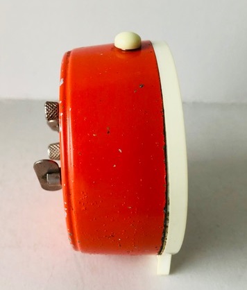 DADIC moto , réveil animé , mouvement mécanique , calibre PA . Nouveauté du catalogue 1983 à la page 4 , référencée 1257-71 . Corps en métal orange, arrêt de sonnerie sous la bélière , vitre en verre plat , aiguilles blanches , aiguilles lumineuses , animation : le drapeau oscille en permanence . Diamètre 10,8 cm . Les DADIC sont apparus en 1976 avec tout d’abord les modèles clown et moto , subissant quelques évolutions esthétiques au cours des années . En 1983 apparaissent quatre versions supplémentaires: le Chat -Souris , le Football , Far-West et Princesse aux Colombes . Le DADIC moto est plus disponible jusqu’au catalogue 1985 page 38 où il change de réf pour prendre la réf: 2429