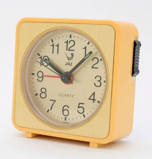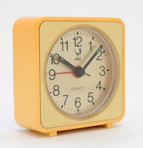 Trois couleurs disponibles : blanc à cadran noir réf. 1246-13 ; jaune à cadran noir réf. 1246-73 ; corail à cadran blanc réf. 1246-73 . Diamètre 11 cm .