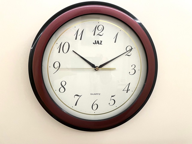 7237 ( circa 1999) Horloge murale ronde en plastique de couleur blanche avec dateur : date et jour , trotteuse centrale , chemin de fer, mouvement Jaz quartz à pile LR6. Diam: 23 cm