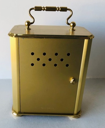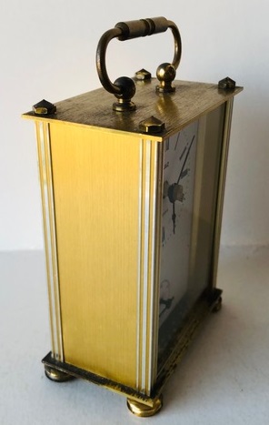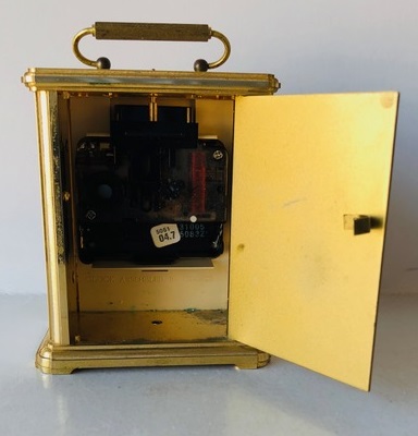 6296 petit réveil, pendulette style officier, corps en laiton doré , quantièmes de lune, chiffres romains bélière, mouvement quartz à pile LR6, présente uniquement uniquement au catalogue 1986 page 20 . Format 14,5 x 9,5 x 6,5cm
