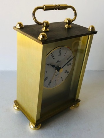 5146 réveil style pendulette d’officier, gamme Jaz Quartz , mouvement quartz à pile LR6, aiguilles poire et feuille non-lumineuses, trotteuse centrale noire, chiffres romains, nouveauté du catalogue 1993/94 page 28, disponible jusqu’en 1995. corps tout en laiton, bélière. format: 13,5 x 10 x 5 cm. Poids: 379 gr.