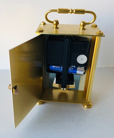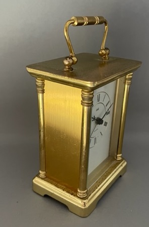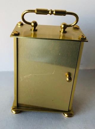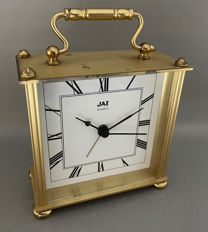 Pendule à poser style Pendulette d’officier sans fonction réveil , sonne les heures, corps en laiton ,aiguilles noires poire et feuille , chiffres romains , mouvement quartz à pile LR6, Poids: 775 gr circa 1999
