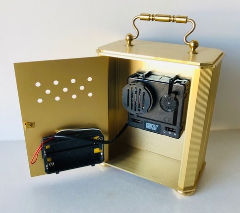 5308 pendulette style officier, nouveauté du catalogue 1987/88 à la page 18, mouvement à quartz à pile LR6 , chiffres romains , aiguilles noires fleur de lys , corps en laiton doré , bélière. (Dans le catalogue 1990 la réf: 5088 est fautive , il s’agit d’une erreur d’imprimerie ) Dim: 9 x 6,5 x 12,5 cm .Poids: 530 gr.