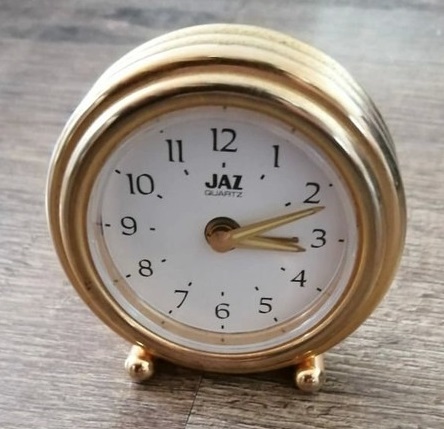 G5432 , réveil rond en laiton doré , pieds torpilles /obus , aiguilles dorées , mouvement quartz à pile bouton Lr44 , calibre 25507 par Tochigi Tokei Japan , diamètre 6,5 cm , épaisseur 3 cm .Présent uniquement au catalogue 1997/1998 page 7 .