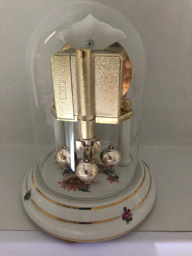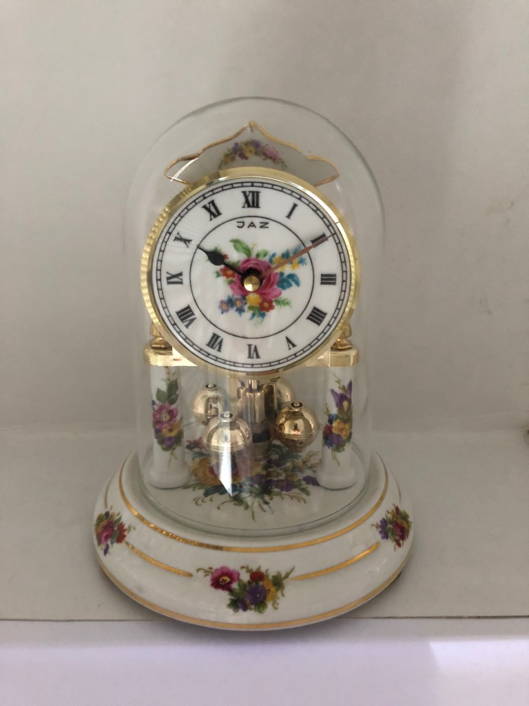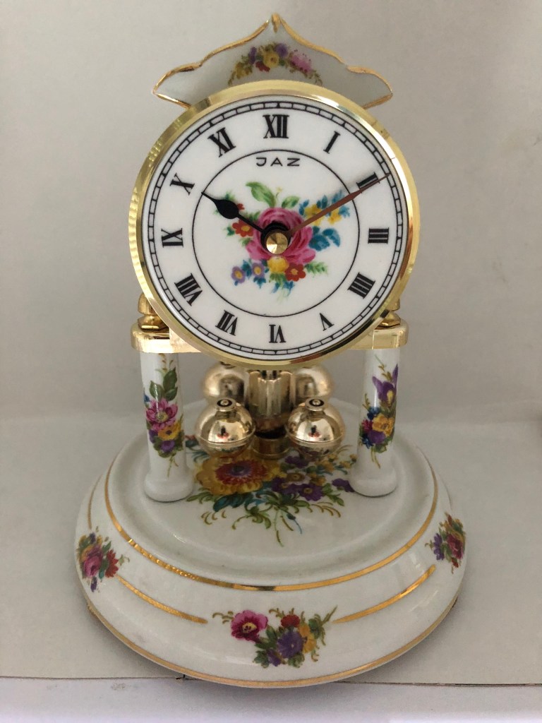 7844 , horloge de style 400 jours , cadran /colonnes et socle en porcelaine , sous globe , décor floral , chiffres romains , aiguilles noires poire et feuille , chemin de fer au pourtour du cadran , quartz , à pile LR6 , Made in Germany , hauteur 18 cm . Présente au catalogue 1988/1989 uniquement . Le logo Jaz est très inusité dans sa typographie .