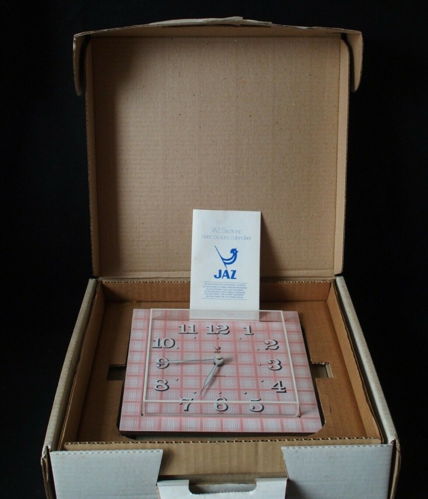 VINIC , pendule murale , gamme Jaz Quartz et Jaz Paris , mouvement à quartz , pile LR6 , calibre MAK . Nouveauté du catalogue 1984 . Plaque de stratifié sérigraphiée , vitre en plexiglas carrée , aiguilles feuilles blanches à bordures noires . Deux couleurs de quadrillage disponibles : bleu réf. 7182-50 , rose réf. 7182-60 . Format 23 x 23 cm .