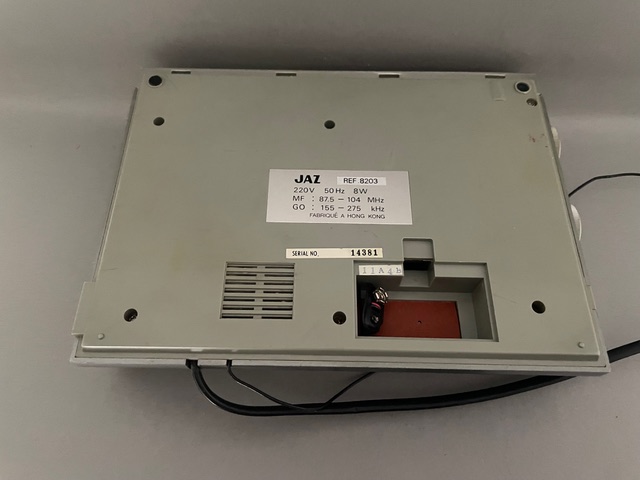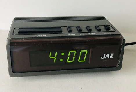 5716 réveil , gamme Jaz Tech, répétition de sonnerie, affichage numérique vert . Nouveauté du catalogue 1994/95 page 48. Boitier blanc plastique présent jusqu’en 2000. réserve de marche sur pile LR6 et secteur 220 volts . Format 4,7 x 9,7 x 9,5 cm