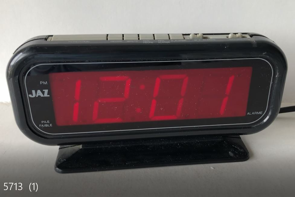 5713 réveil à Led, à répétition de sonnerie , témoin de pile faible, nouveauté du catalogue 1991 page 10 disponible jusqu’en 1994. PileLR9 + sur secteur 220 volts, format poids: 353 gr. Made in China