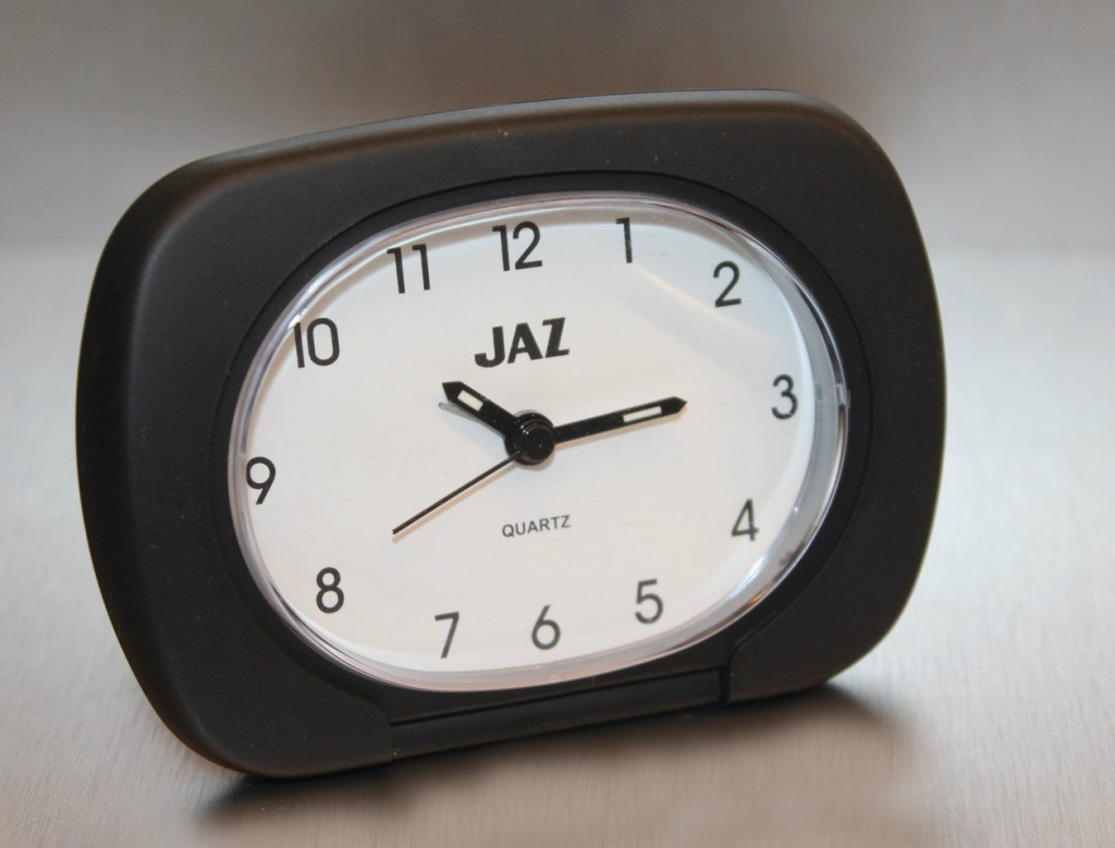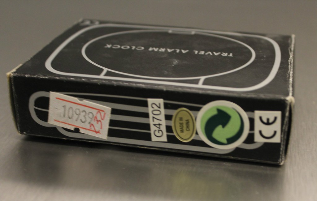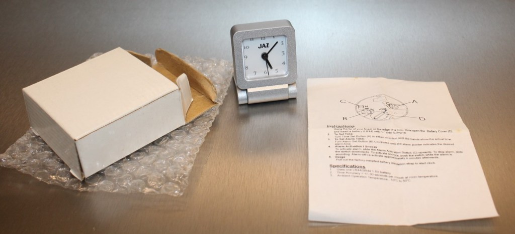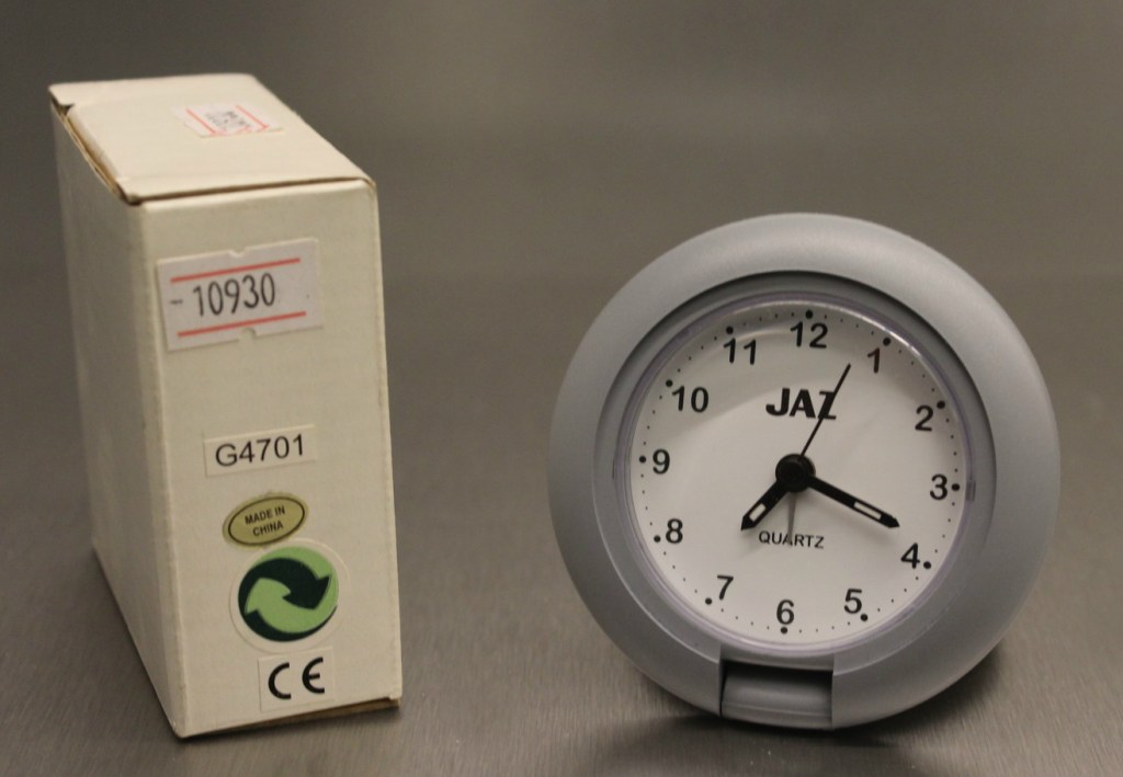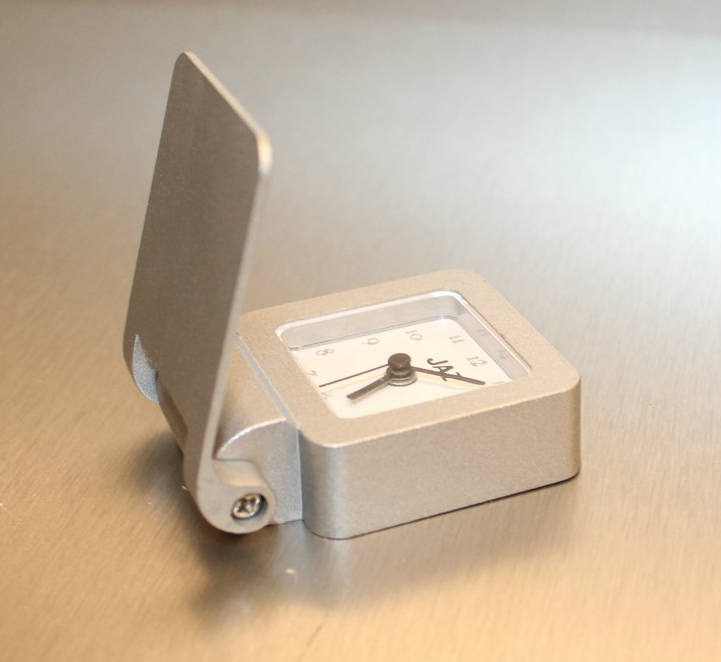 MERIC , petit réveil de voyage , gamme Jaz Quartz , à pile LR6 , corps en aluminium brossé réf. 8999-41 ou métal doré réf. 8999-81 , forme rectangulaire , écran LCD , Made in Hong Kong . Format 12,5 x 4,5 cm