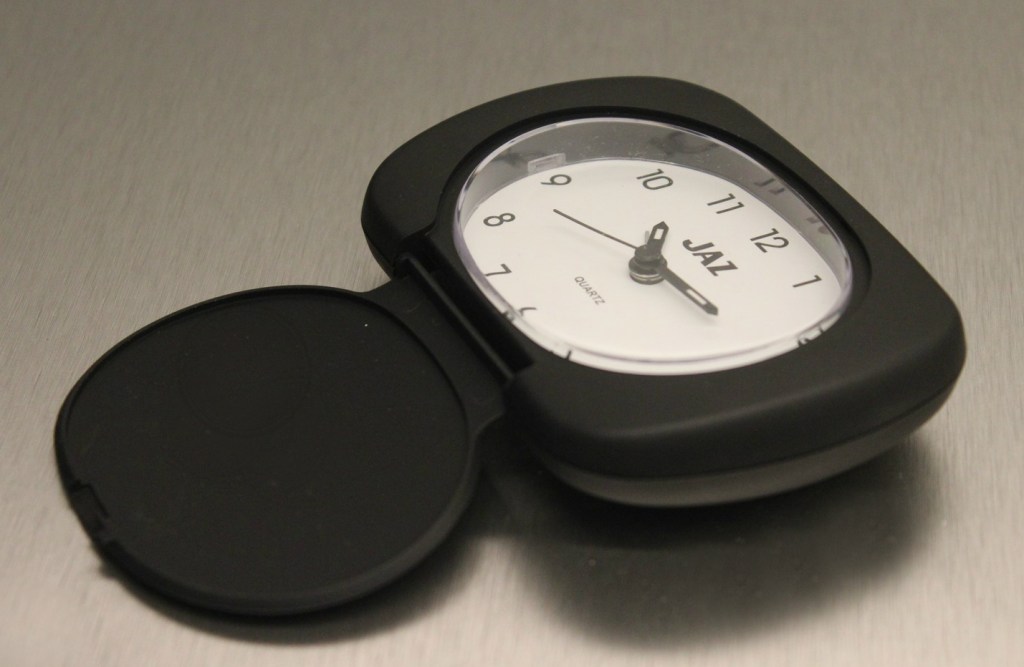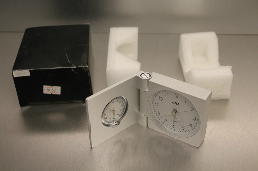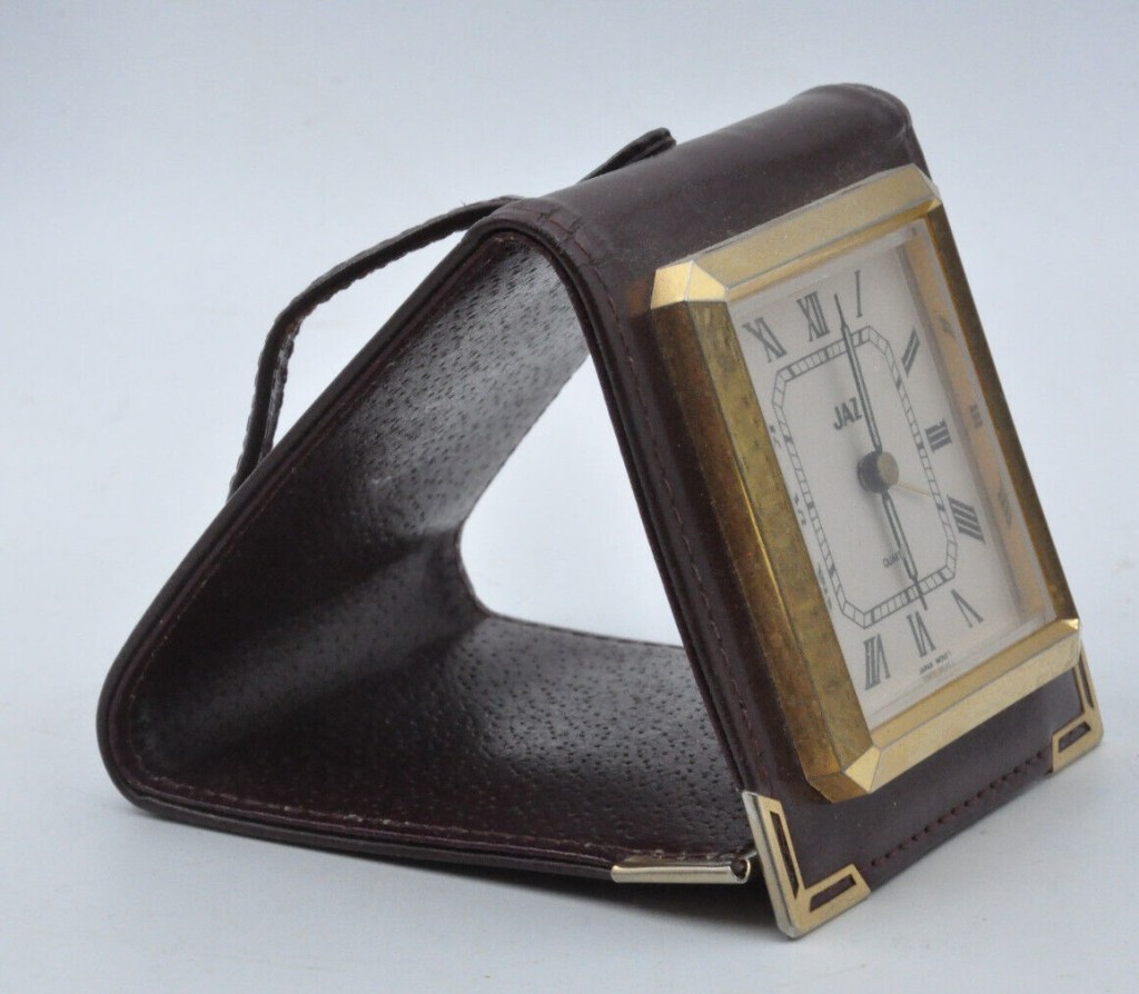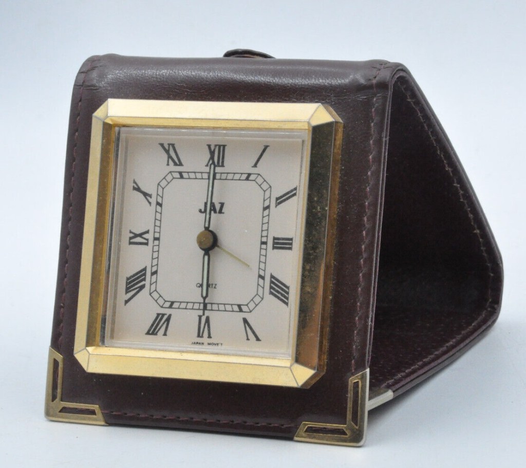 5416/5417 , réveil de voyage , cuir noir ou bordeaux véritable , chiffres romains , chemin de fer octogonal à l’intérieur de la zone des heures sonnerie simple , mouvement Tochigi Tokei made in Japan , pile LR44 ,format 8,5 x 8 cm, poids 109 gr . Présent au catalogue 1988/1989 page 19 uniquement.