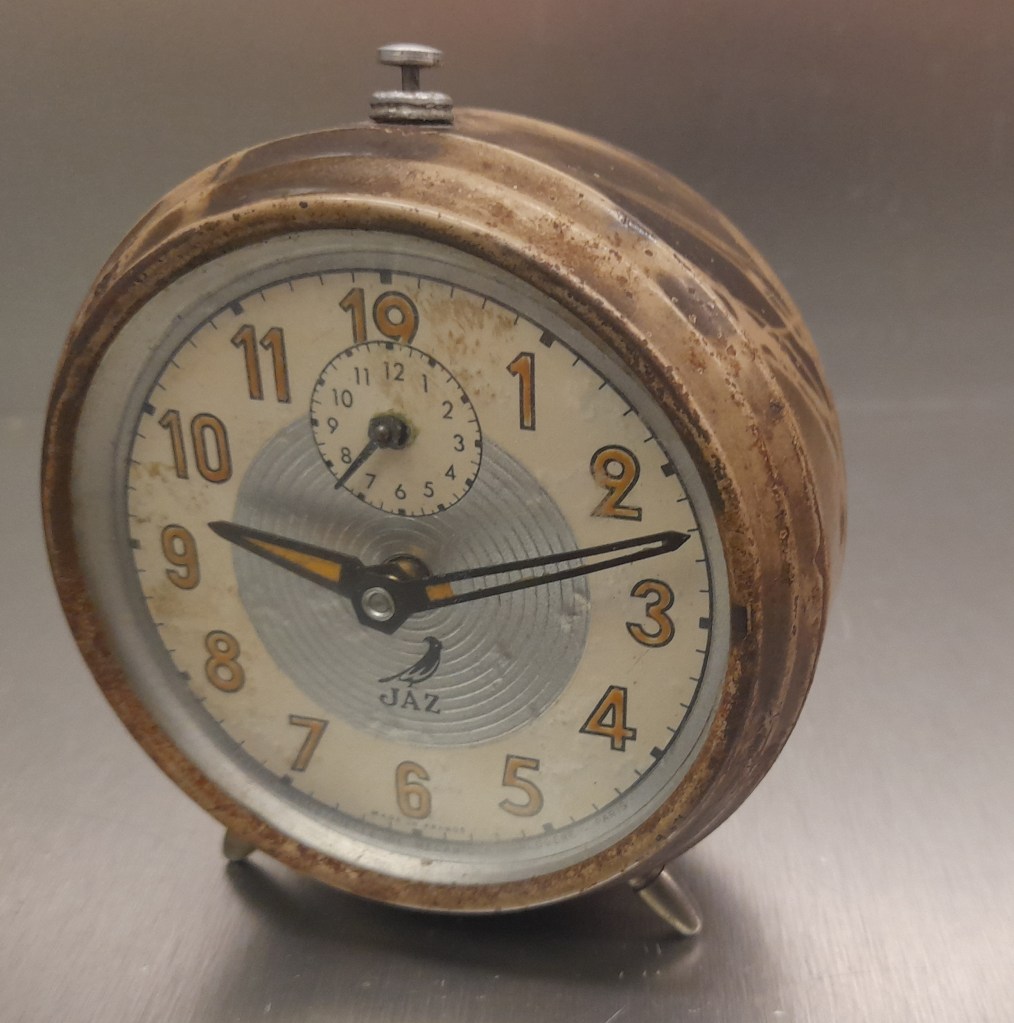 Ce type d’aiguilles et ce genre de pieds n’ont jamais été employés par Jaz pour d’autres réveils; ce réveil est à rapprocher de sa version avec bélière . Le calibre Z est identique à celui du modèle à bélière, sauf l’inscription portée en bas et non sur le côté