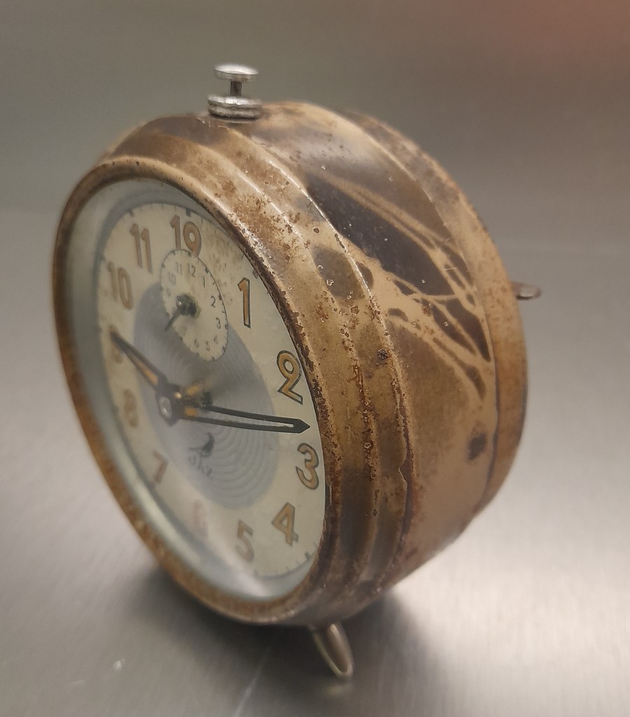 Réveil mécanique , hors catalogue peut être destiné à l’export , Swiss Made , mouvement mécanique , calibre Z , pas de bélière , aiguilles et chiffres lumineux , arrêt de sonnerie au sommet diamètre 9,5 cm . Photos courtoisies du collectionneur Serge Benatti .