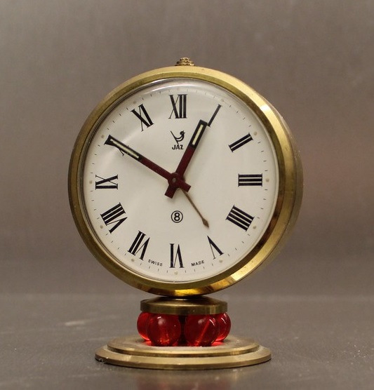 Petit réveil , mouvement mécanique , calibre CH ,7 jewels . Cadre et socle en métal doré , cadran en métal brossé , vitre plate en plexiglas , chiffres Breguet , aiguilles Breguet , aiguilles et points lumineux . Format 7 x 7,5 cm , 275 gr . Le chiffre 8 dans un cercle qui est reproduit au cadran rappelle l’autonomie de 8 jours de ce calibre d’origine suisse , justifiant la mention Swiss Made sous le VI .La mention Swiss est redoublée au dos La référence 800 CH de ce calibre , à échappement ancre et 7 pierres , fait évidemment référence à son origine suisse . Daté en creux de 1970 sur le calibre , ce réveil n’apparaît pourtant pas aux catalogues français de cette période . Le calibre 800 CH fera sa première apparition officielle au catalogue 1971/72 dotant les BANIC , BRILIC , BRONZIC , BULIC et le réveil de voyage BERNIC . Mais nous savons par les Jazettes , le journal interne de communication avec les horlogers affiliés , que Jaz testait régulièrement de nouveaux modèles à l’export avant de les introduire ou pas sur le marché français comme par exemple la LORENESE qui ne sera vendue qu’en Italie . Apparemment ce modèle , que nous avons acquis en Allemagne , ne sera pas retenu mais avait servi de test pour les cinq modèles cités plus haut qui ne seront proposés qu’aux catalogues 1971/72 et 1972/73 . En 1974 tous les réveils 8 jours sont supprimés du catalogue , les modèles électroniques ayant pris leur place . Voir un exemplaire similaire de 1968