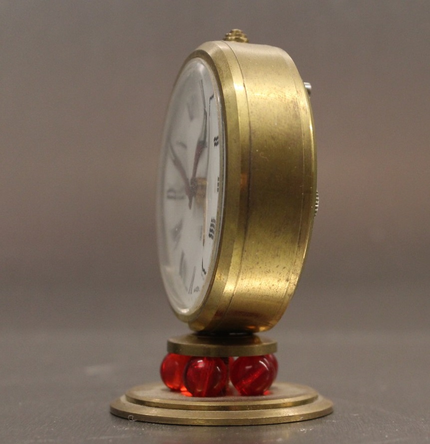 BULIC , petit réveil , mouvement mécanique , calibre CH , autonomie 8 jours , Swiss Made . Nouveauté du catalogue Jaz 1971/72 à la page 11 , référencée 1702-11 . Corps métal façon or brossé , finition diamant , aiguilles et points lumineux , chiffres romains . Diamètre 6,5 cm , hauteur 8,5 cm , poids 245 gr . Ce décor de boules rouges a inspiré son nom de BULIC