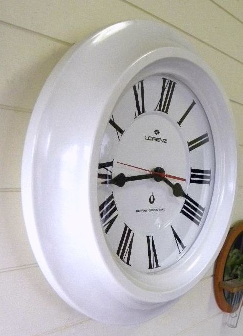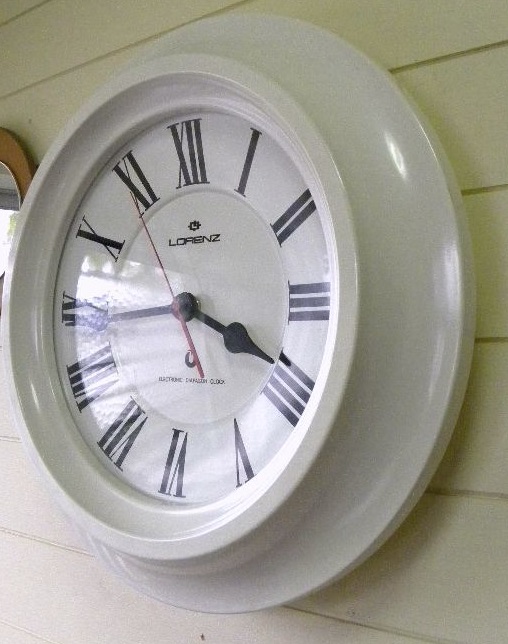 Saint Tropez , horloge murale, gamme Jaz Quartz, tôle émaillée ronde, calibre MAK, sans trotteuse, mention assembled in France au dos, disponible uniquement au catalogue 1988/1989, référencée 6381, poids 685 gr sans la pile LR6, diamètre 27 cm