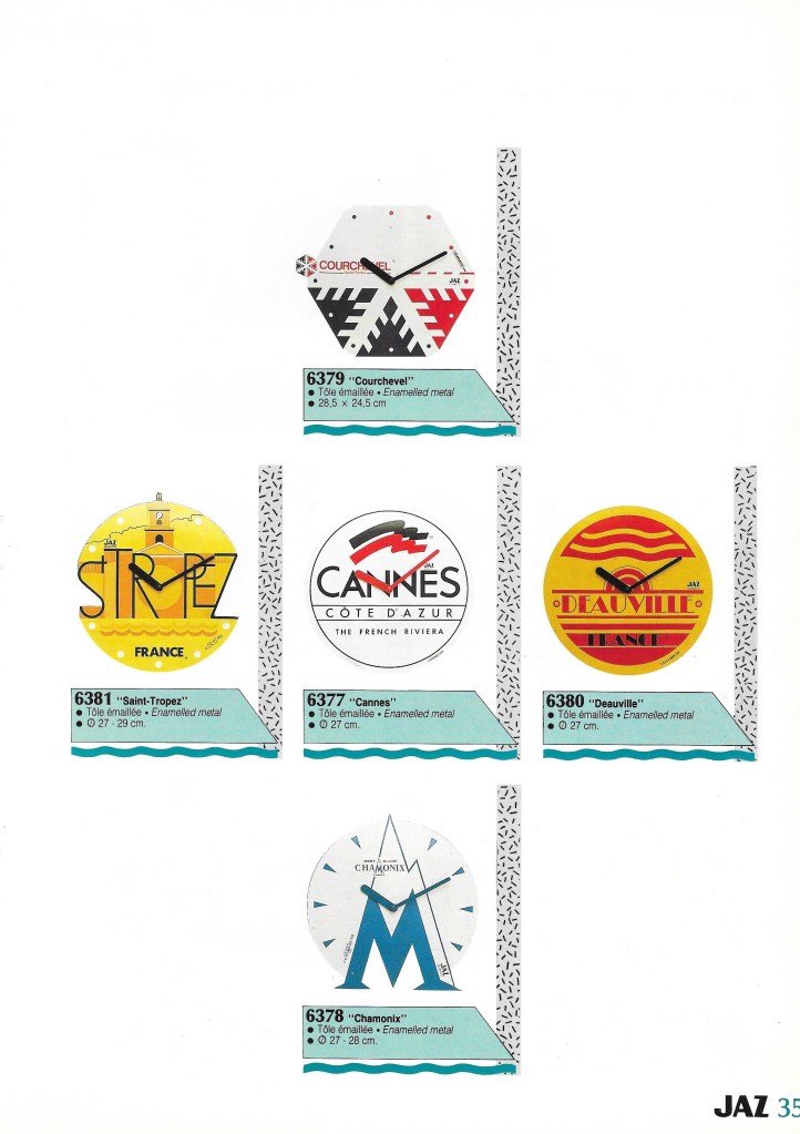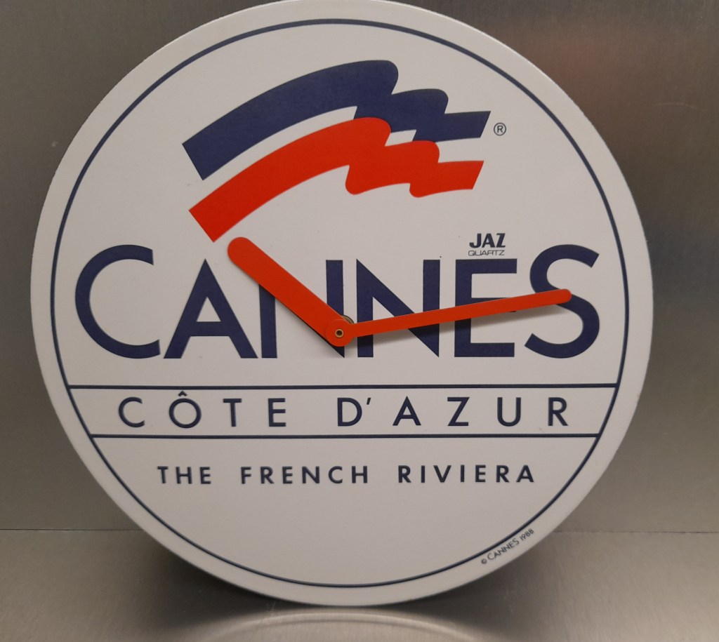 CANNES horloge murale, gamme Jaz Quartz, tôle émaillée ronde, calibre MAK, sans trotteuse, mention assembled in France au dos, disponible uniquement au catalogue 1988/1989, référencée 6377, poids 685 gr sans la pile LR6, diamètre 27 cm