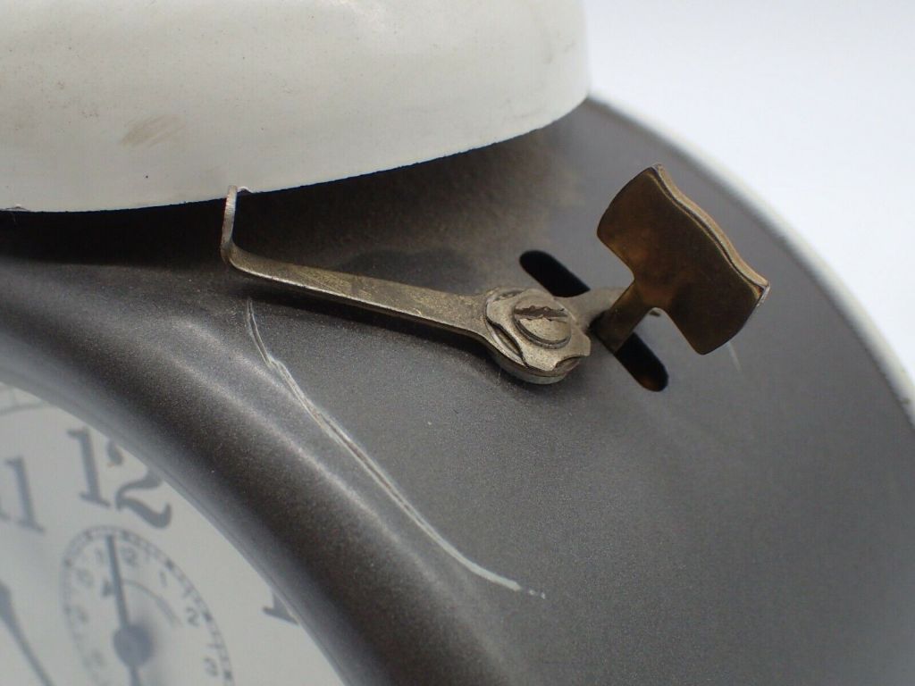 On notera les trois pattes de fixation qui rappellent celles d’un COMTIC . Il s’agit d’ailleurs d’un de ces minuteurs dont le cadran à été élargi pour des raisons évidentes de visibilité à des fins publicitaires . Ces minuteurs offerts par Produits Marguerite aux boulangers pâtissiers avaient besoin d’être bien fixés dans leurs laboratoires .
