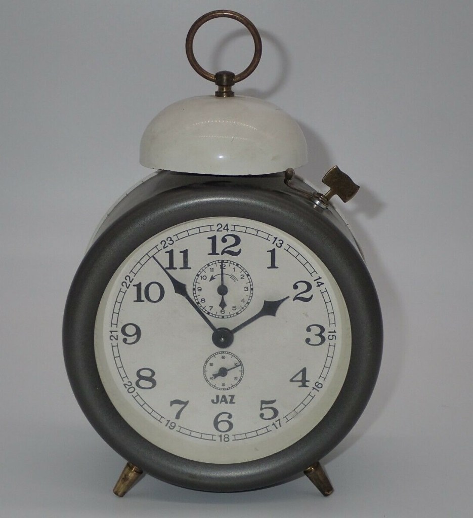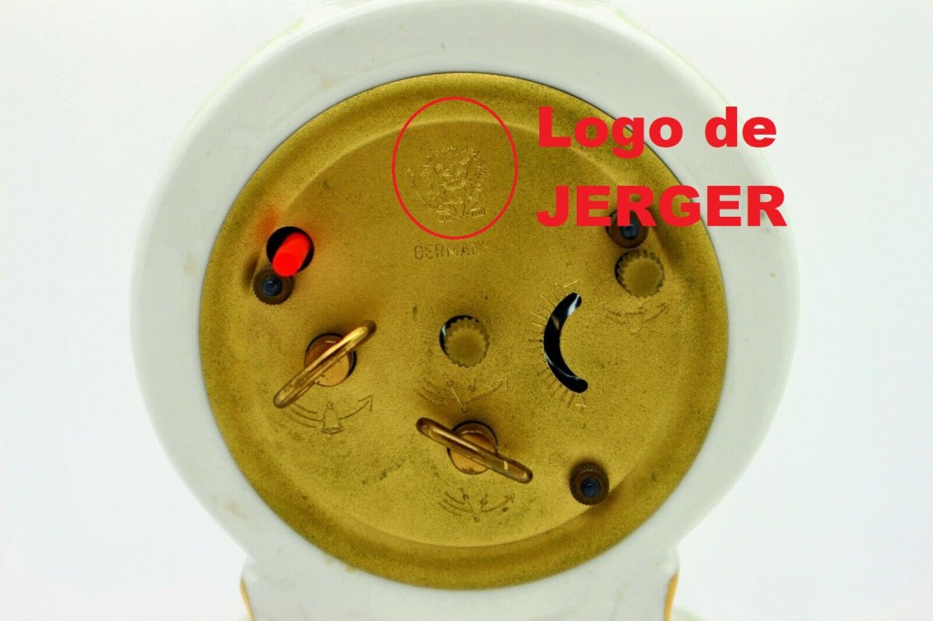 2493 , réveil rond , à cloche blanche, corps en tôle peinte en gris métallisé , arrêt de sonnerie au sommet , aiguilles noires scoties , non-lumineux , cadran blanc , chemin de fer numéroté jusqu’à 24 , présent uniquement au catalogue 1988/1989 page 24 référencé 2493 , fabriqué par JERGER Made in Germany , entreprise d’horlogerie allemande qui produisit également des gros réveils ronds pour Vedette qui a imprimé son logo au petit lion au dos .