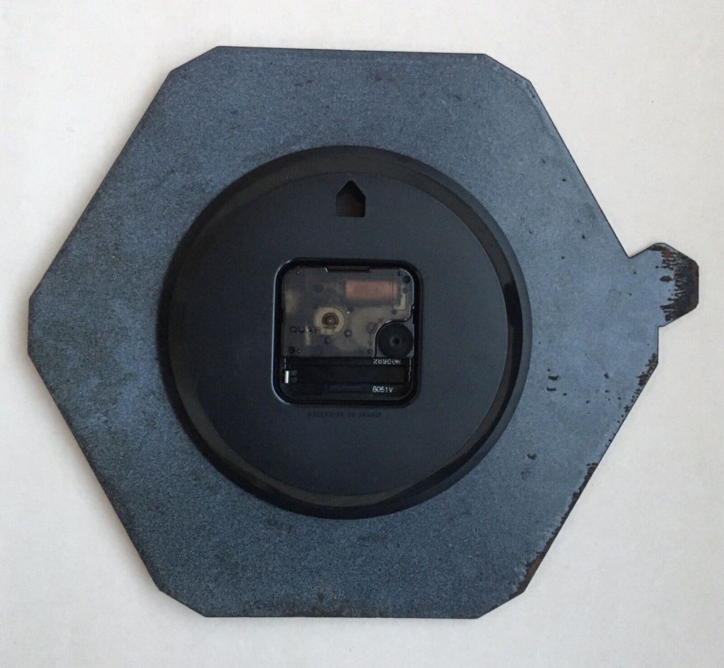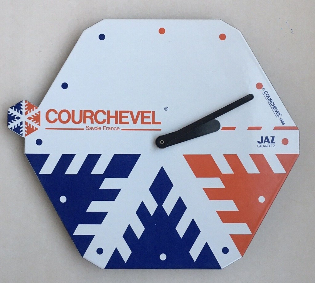 COURCHEVEL horloge murale, gamme Jaz Quartz, tôle émaillée octogonale, calibre MAK, pile LR6, sans trotteuse, mention assembled in France au dos, disponible uniquement au catalogue 1988/1989, référencée 6379, 28,5 x 24,5 cm.