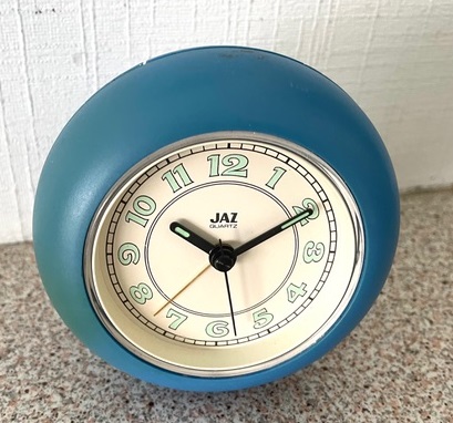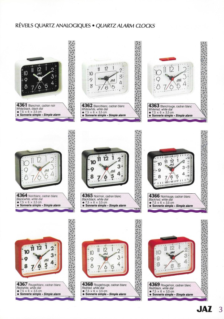 4392 / 4393 réveil rond, gamme Jaz Quartz, à pile LR6. Nouveauté du catalogue 1990 dans le fascicule « Les Pratiques » . Coque en plastique de couleur bleu pour la réf: 4392 et coque jaune pour la réf: 4393, chemin de fer, aiguilles et chiffres lumineux, trotteuse centrale. Diam: 8,8 cm