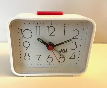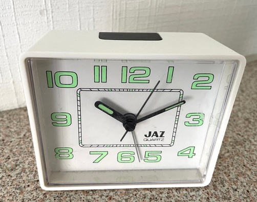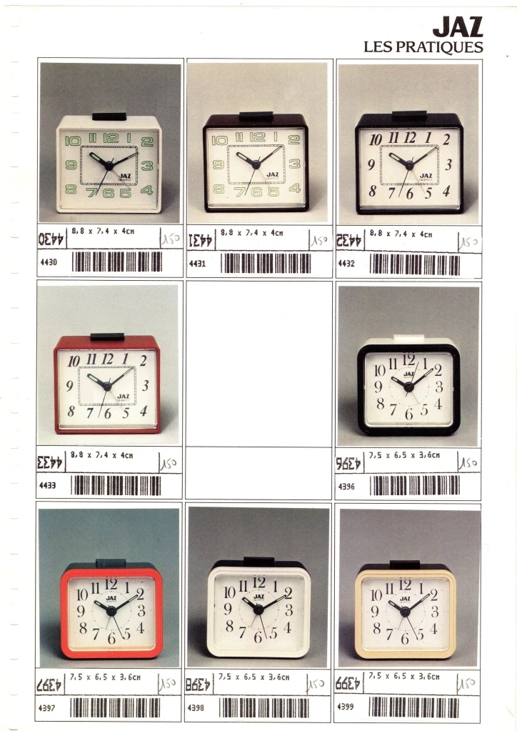 4430/4431 Réveil en plastique rectangulaire en plastique , gamme Jaz Quartz , à pile LR6, trotteuse centrale , chemin de fer rectangulaire à l’intérieur de la zone des heures, arrêt de sonnerie au sommet , de couleur blanche pour la 4430 et de couleur brune pour la 4431. Présents uniquement au catalogue 1990 dans la catégorie « Les Pratiques ». Format: 8,8 x 7,4 x 4 cm.