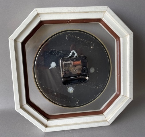 6920 horloge à quartz , cadre octogonal en bois teinté blanc, façade en plexiglas, lunette en métal doré, aiguilles noires poire et feuille , trotteuse centrale rouge. Nouveauté du catalogue 1997/98 page 33, mouvement quartz à pile LR6. Format. 26 x 26 cm