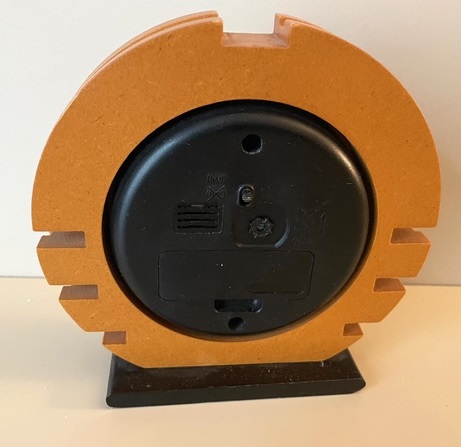 5132 grand réveil , gamme Jaz Prestige, mouvement quartz ,à pile LR6, trotteuse centrale, chemin de fer rond ,arrêt de sonnerie au dos, disponible au catalogue 1993/94 uniquement dans la Collection Spéciale page 49 . Boîtier médium naturel. Socle médit teint noir satiné. Diam: 13 cm