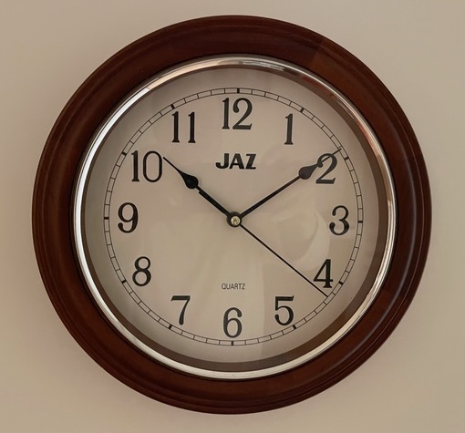 6974 Horloge à quartz circa 1999 ou 2000, quartz à pile LR6, chemin de fer, aiguilles poires , trotteuse centrale noire, corps rond bois teinté acajou, lunette en chrome. Diamètre: 30 cm. Pile LR6