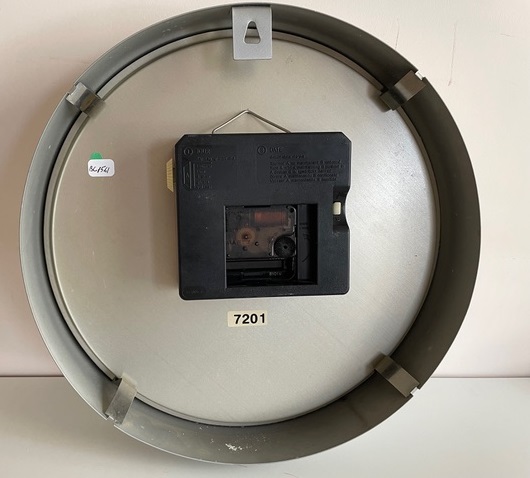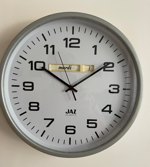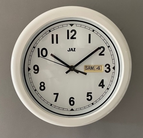 7237 ( circa 1999) Horloge murale ronde en plastique de couleur blanche avec dateur : date et jour , trotteuse centrale , chemin de fer, mouvement Jaz quartz à pile LR6. Diam: 23 cm